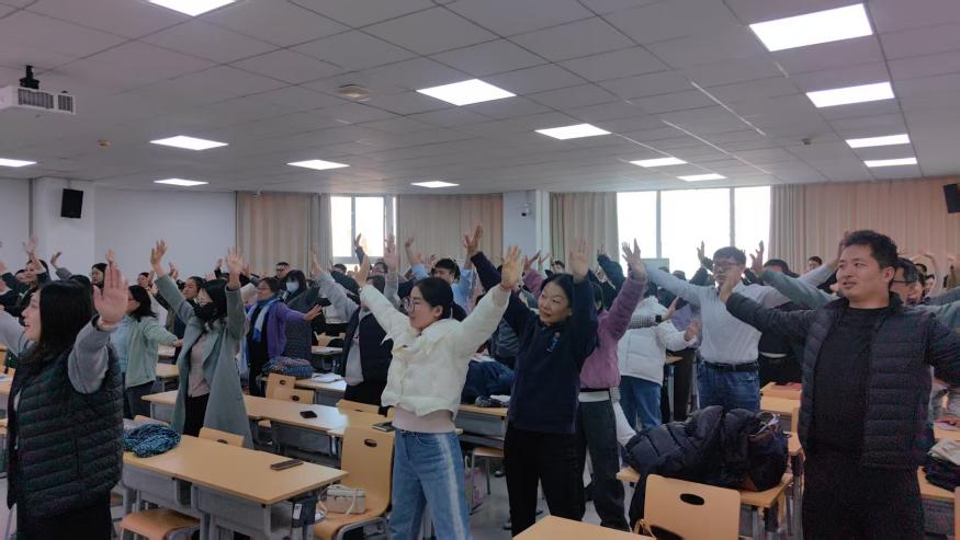 在指导老师的带领下,老师们从“双手托天理三焦”到“背后七颠百病消”,一招一式,认真揣摩,动作逐渐从生疏到流畅,配合深长均匀的呼吸,不仅舒展了筋骨,更让平日紧张的神经得到了有效的放松。活动现场气氛融洽,欢声笑语不断。