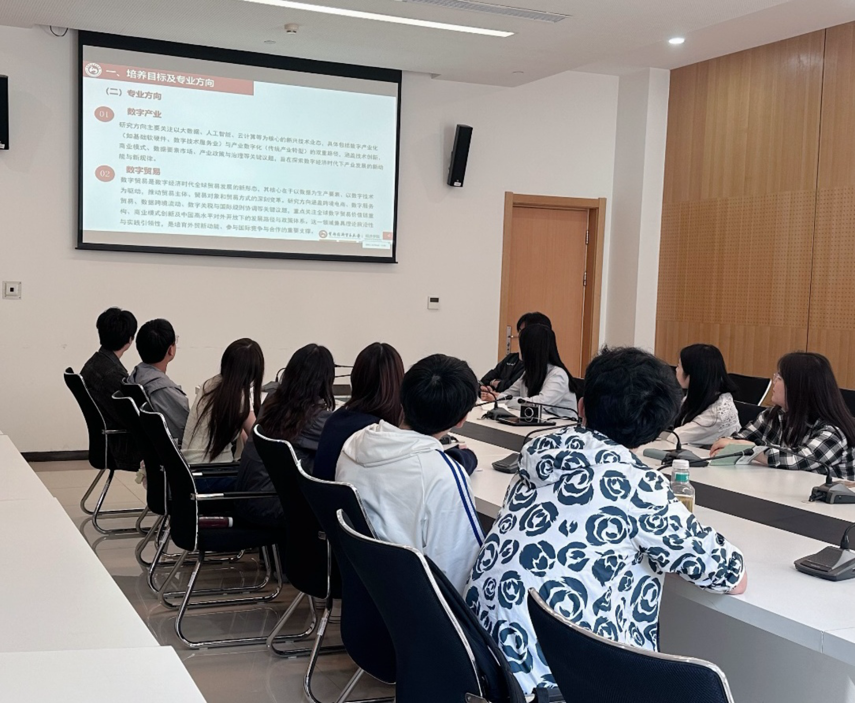随后,刘翠花副教授系统介绍了数字经济专业硕士的培养体系,具体包括培养目标、专业方向、课程设置、学习年限、毕业论文要求及学历性质等内容。她希望学生通过系统学习,不仅能坚定政治立场、恪守职业道德,还能全面掌握数字经济相关知识与技能,强化经济思维、数学思维、创新意识和实践能力,为未来在政府或企业从事数字经济相关工作奠定坚实基础。