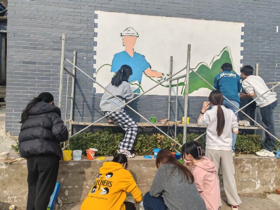 在河北镇的文化墙前,同学们分工执笔,以色彩为媒介,将红色邮路精神与青春担当信念熔铸于画笔。画笔舞动间,一面鲜活的红色文化墙逐渐成型,这不仅是对红色精神的艺术诠释,更凝聚着同学们之间团队协作的智慧与力量。