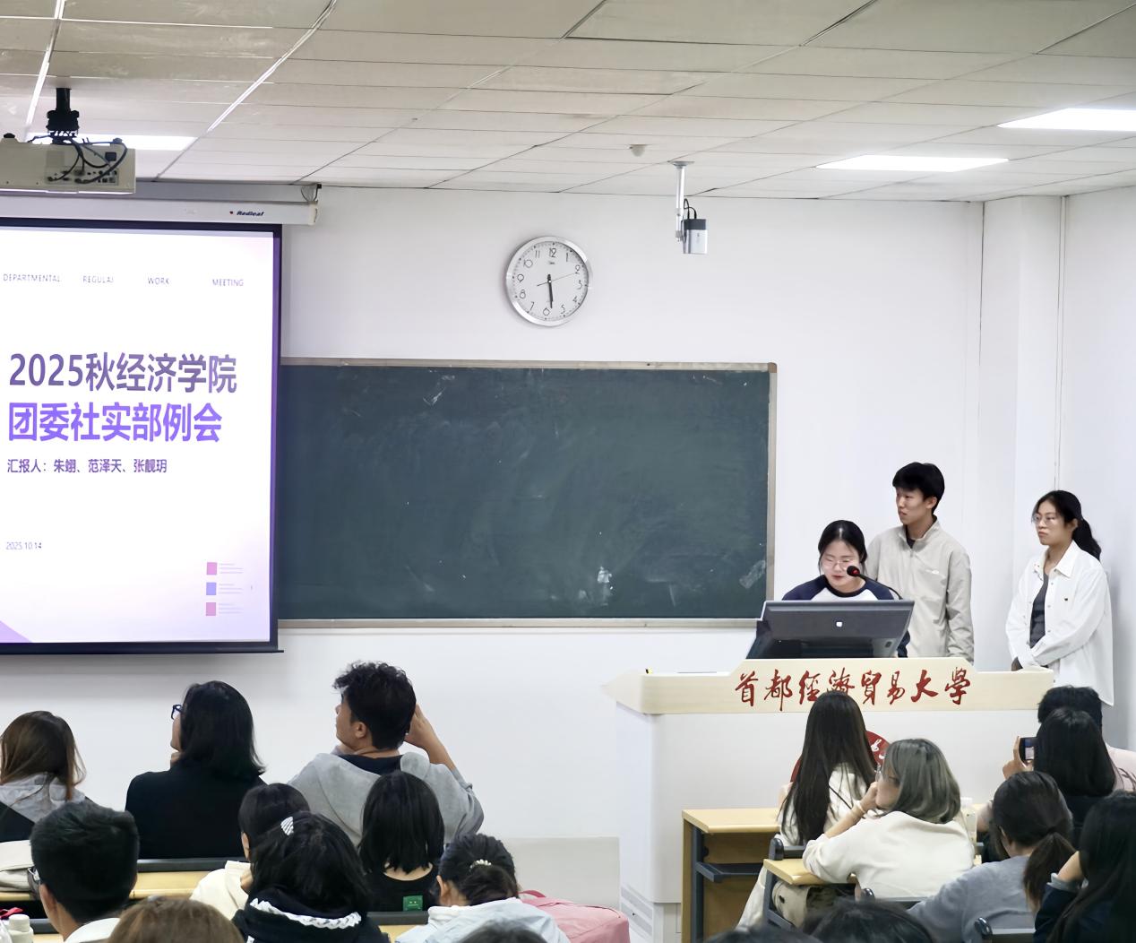 10月14日下午,经济学院团委在启铸恭温楼E104教室召开了2025-2026学年第一学期期初例会。经济学院团委书记陈晓、副书记胡若恬、李泽宇、王辰阳、王笛以及团委全体成员参会。