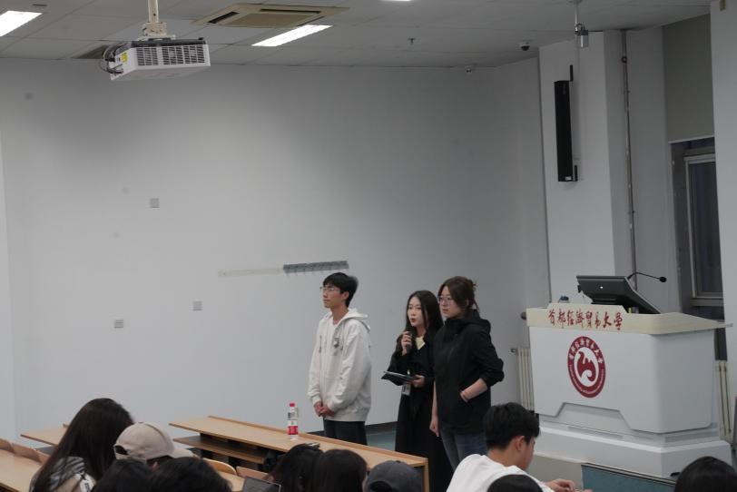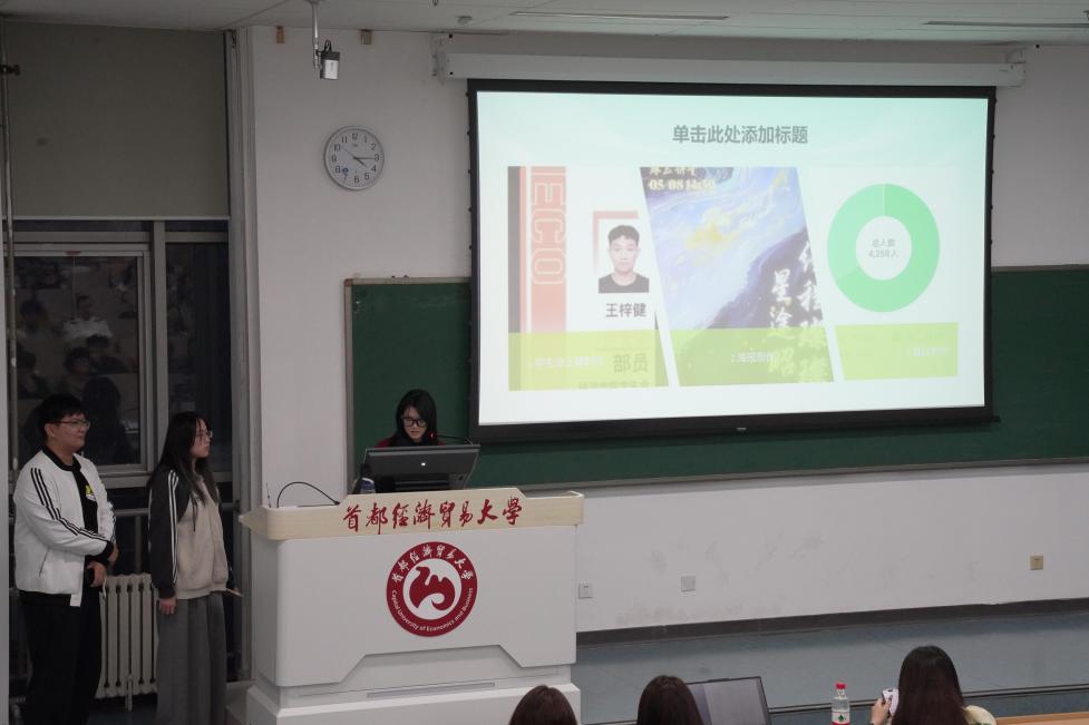 部门工作汇报之前,三位学生会主席团成员戴雅萱、池雯颖和吴杭麒进行了自我介绍,并欢迎大一新生加入经济学院学生会,希望大家可以在这个大家庭里交到新朋友,拥有新收获。希望在新的一年里和学生会成员们再续佳绩,创造经济学院新的辉煌。