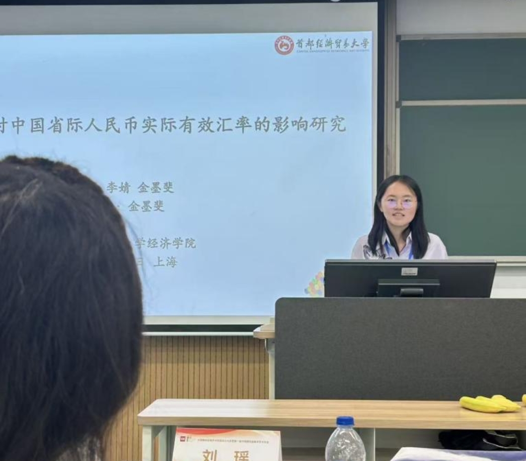 论坛包括4场主旨演讲、2个圆桌论坛和30个平行论坛。本次年会共收到192篇论文,入选会议论文60篇,在30个平行论坛分享。我院国民经济学专业2024级博士研究生金墨斐同学与导师李婧合作的工作论文“气候风险对中国省际人民币实际有效汇率的影响研究”,经过会议论文专家组的评审后入选。金墨斐同学在平行论坛9B宣讲了论文,论坛主持人山东财经大学王营教授和点评人中国社会科学院刘瑶副教授肯定了选题的前沿性和现实意义,对模型的内生性处理、机制检验的深度等关键问题提出了建设性的意见。会议中,金墨斐同学还与其他专家和与会者进行了交流,在思维碰撞中更加了解研究领域最新思想和动态,开拓了学术视野,激发了科研热情和研究兴趣。