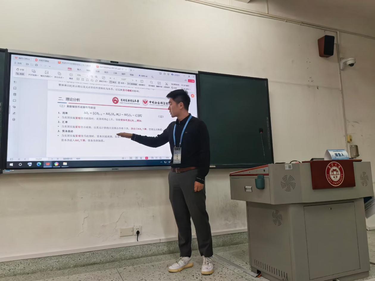 我院2023级国民经济学博士研究生李博渝作为作者代表汇报了论文“美联储货币政策对发展中国家债务的溢出效应研究”,论文通过构建开放经济条件下两国经济模型,采用1985-2023年79个发展中国家的面板数据对美联储货币政策溢出效应进行实证检验。研究发现,美联储货币政策调整成为发展中国家债务风险的放大器,冲击对不同特征的经济体具有明显差异。论坛主持人刘威教授,评论人冯永琦教授对论文做出中肯的评价与建议。四位作者与参会的其他专家和学者进行了充分交流,对当前中国和世界经济的重点研究问题有进一步深入理解。