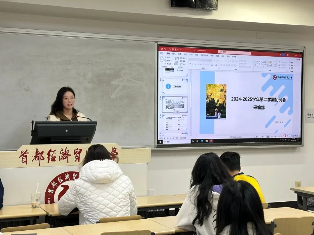 采编部部长曹思齐回顾了上学期的工作成果并介绍了下学期采编部的工作安排。她指出,在新的学期里同学们要开始学习微信公众号平台的使用和推送发布等工作。在最后,曹思齐提出了同学们本学期的工作重点并介绍了将要举行的大型活动,并表示希望部员们这学期仍然能够尽早完成每天的推送任务,以及重要活动尽量保证出勤,有任何疑问应当多沟通交流,争取高效解决问题。