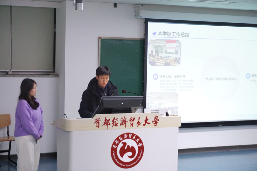 团委社会实践部在汇报时指出,本学期开展了暑期社会实践优秀作品推送,举办了“挑战杯”系列竞赛专题指导讲座,并完成了竞赛材料收集等工作,其中“挑战杯”竞赛专题讲座深受同学们的欢迎。部门负责人表示,本学期各项既定工作已高质量完成,下学期将探索创新工作模式,激发部门活力,持续提升工作质量与细致度。