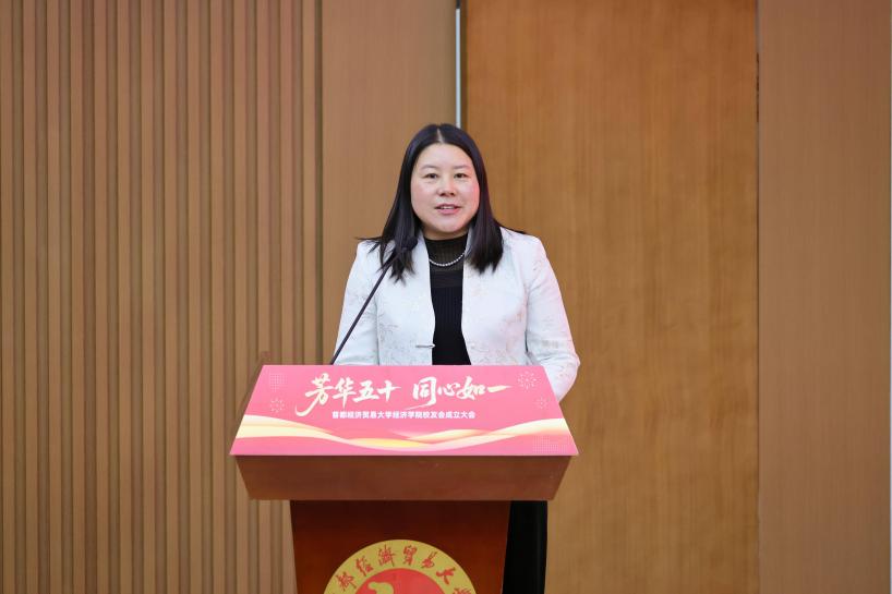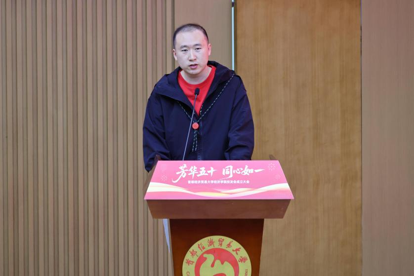 李鲲鹏代表学校对经济学院校友会的成立表示热烈祝贺,从筚路蓝缕到蒸蒸日上,他充分肯定了经济学院五十一年来在学科建设、人才培养与服务首都发展等方面取得的扎实成果。他对新成立的经济学院校友会提出三点希望:一是成为“温暖的港湾”,增强“经院人”的归属感与凝聚力;二是成为“互促的平台”,通过校企合作、导师引领等方式,实现校友与学院发展的同频共振、互利共赢;三是希望校友成为“母校的名片”,继续在各自领域发光发热,汇聚正能量,共同助力学院、学校乃至社会的高质量发展。