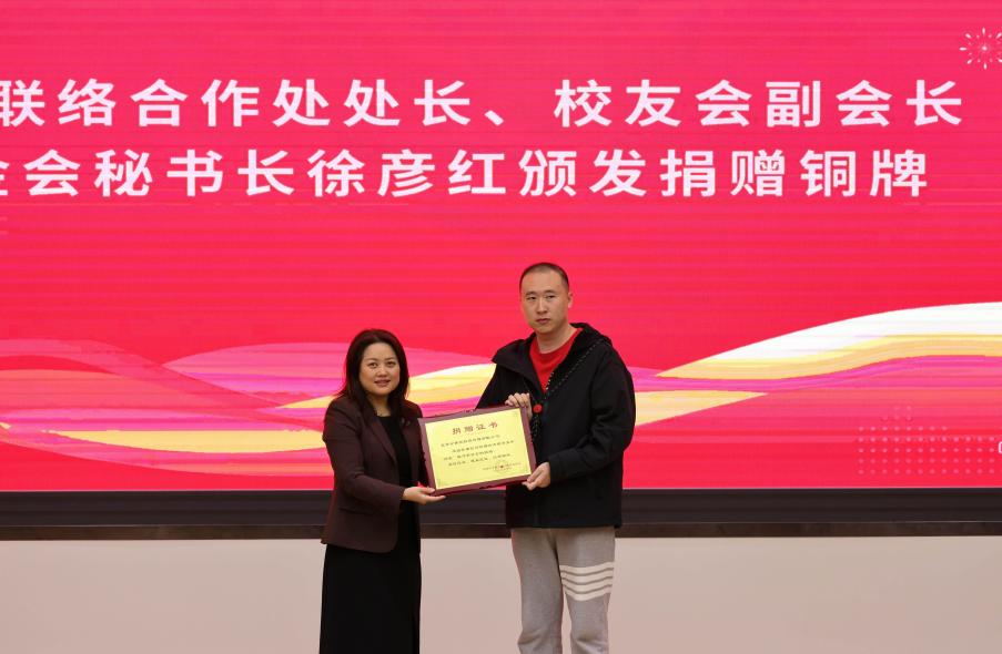 徐彦红向捐赠单位颁发了捐赠铜牌,感谢校友对母校发展的支持。