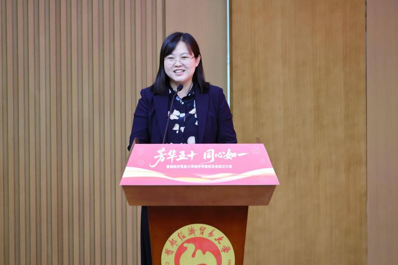 杜雯翠在发言中衷心感谢了学校、各界校友和学院师生的支持,并介绍了经济学院的卓越办学成果——踏浪于时代潮流,如今已是拥有理论经济学、应用经济学两个一级学科博士点的学院,积极建设起数字经济本硕专业,经济学教师团队成功入选“全国黄大年式教师团队”创建示范团队,为培育栋梁之材奠定坚实基础。她阐述了优秀校友与经院教育人民属性的内涵,并表示学院校友会将为经院学子搭建起温暖、有力的互动平台、彼此团结有爱,将经院之火代代相传,共同写就更加辉煌的历史篇章。